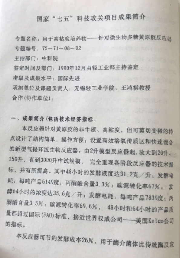 上世纪80年代,他作为国家“七五”科技攻关专题项目的主持人,完成了“黄原胶生物反应器研制”项目,通过了中国科学院组织的专家鉴定验收,获得好评,并获得原国家轻工业部科技进步三等奖。当时评奖很难,一等奖几乎没有,二等奖也很少。