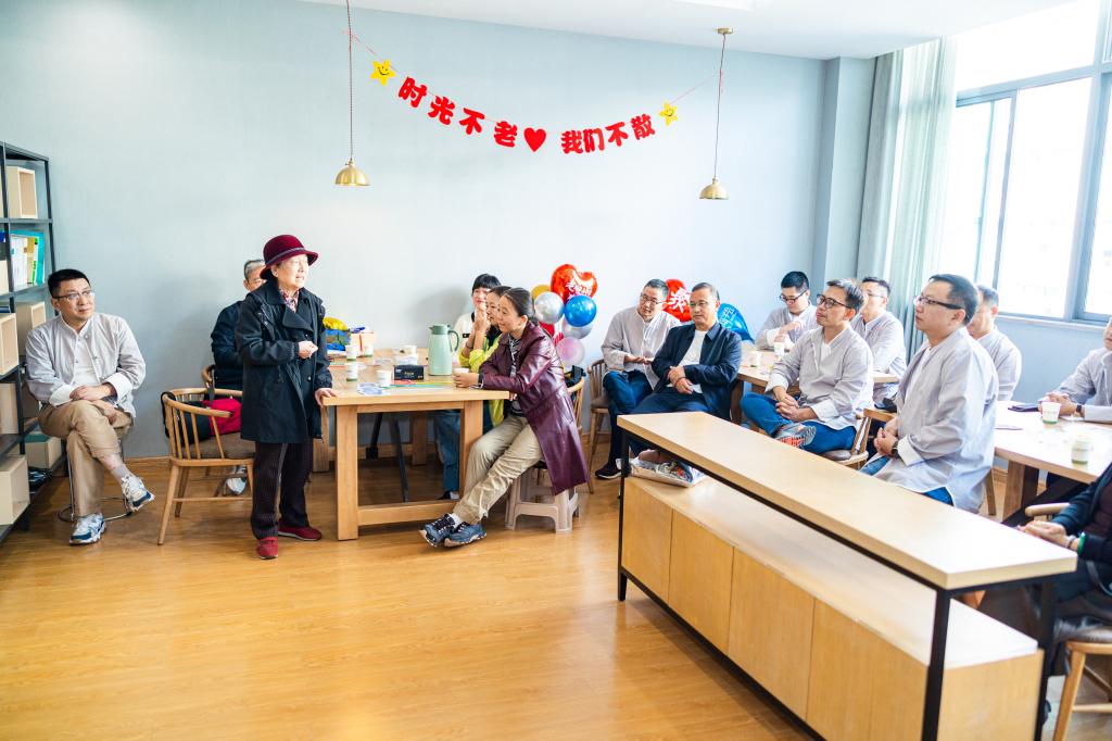 秋日暖阳下,校友们参观了公益图书馆、教学楼、小蠡湖、赤马咀等校园建筑和景观,共同追忆峥嵘岁月,切身体会母校的巨大变化,并为母校的蓬勃发展感到由衷的欣慰和自豪。随后,校友们来到UED体育 教职工之家进行座谈,与当年的班主任路桂荣老师和李华钟老师深入交流,开心畅谈,并为老师们献上鲜花。时值学校即将迎来建校65周年,校友们也为母校送上了美好的祝福。