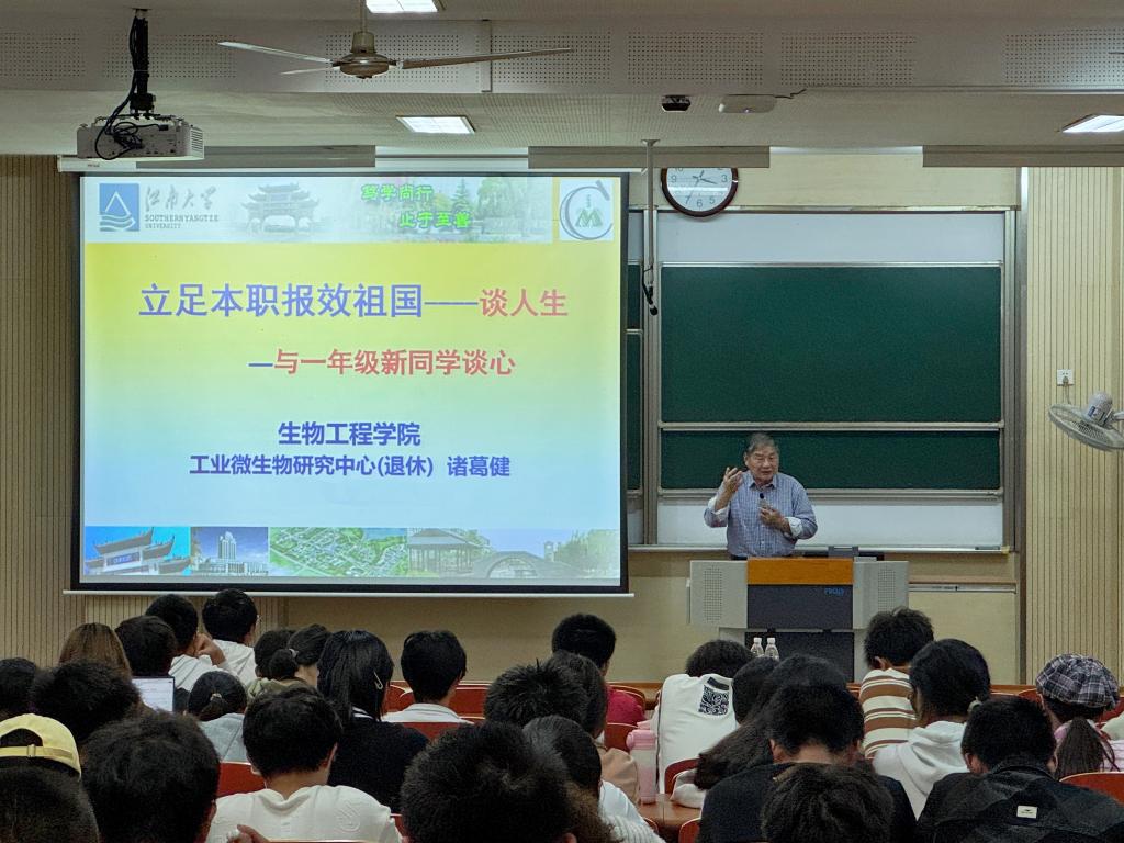 2024级新生转型教育系列讲座在第一教学楼1B103举行,江南大学关工委特邀报告员、博士生导师诸葛健老师作《立足本职,报效祖国——谈人生》主题报告,2024级本科新生参与。讲座由2024级本科生辅导员王珏主持。
